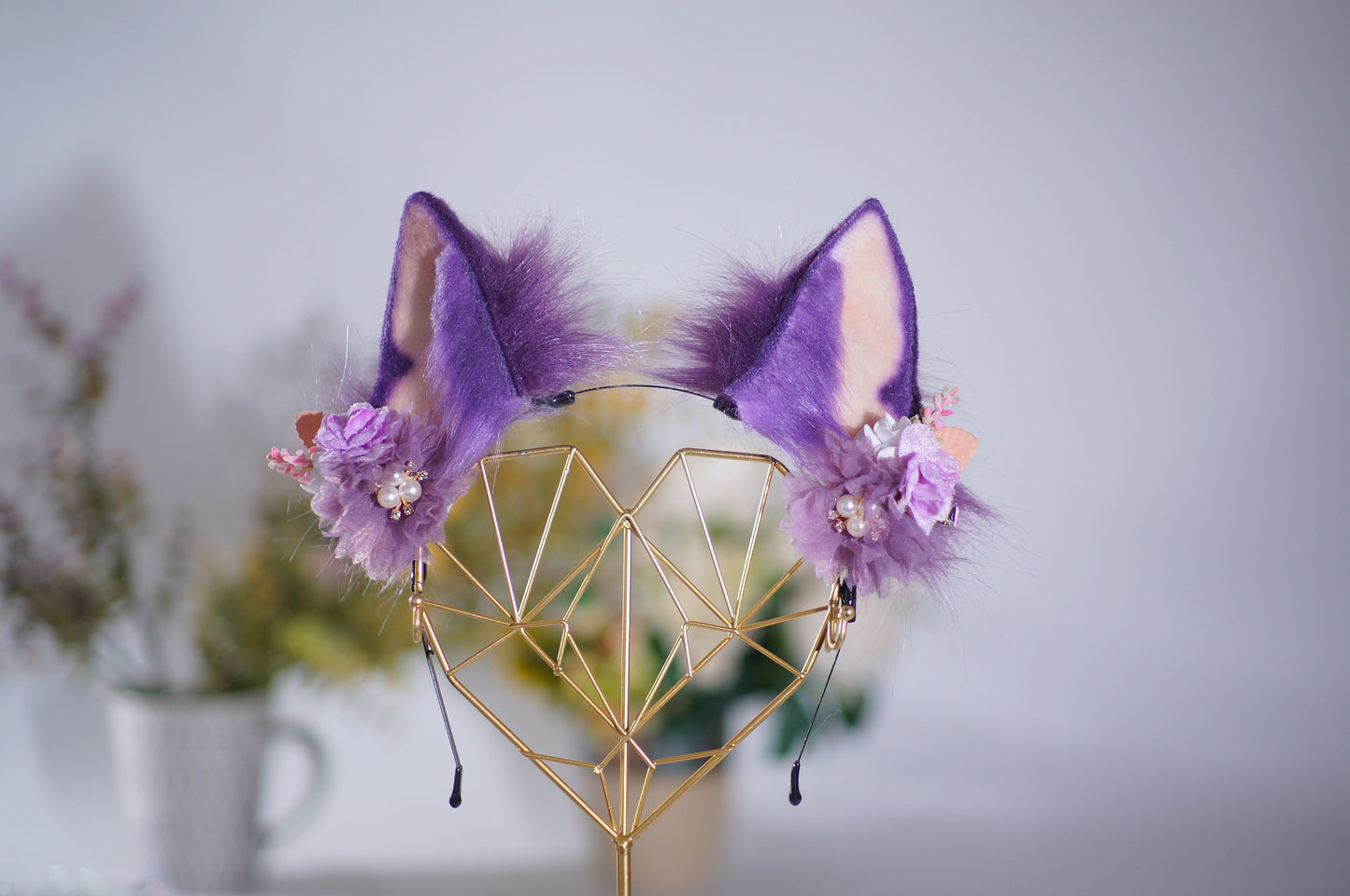 Floalral purple fox ears , purple cat, fox ears, cat ears headband,kitten ear, furry animal ears, cosplay furry headband, uploader ears